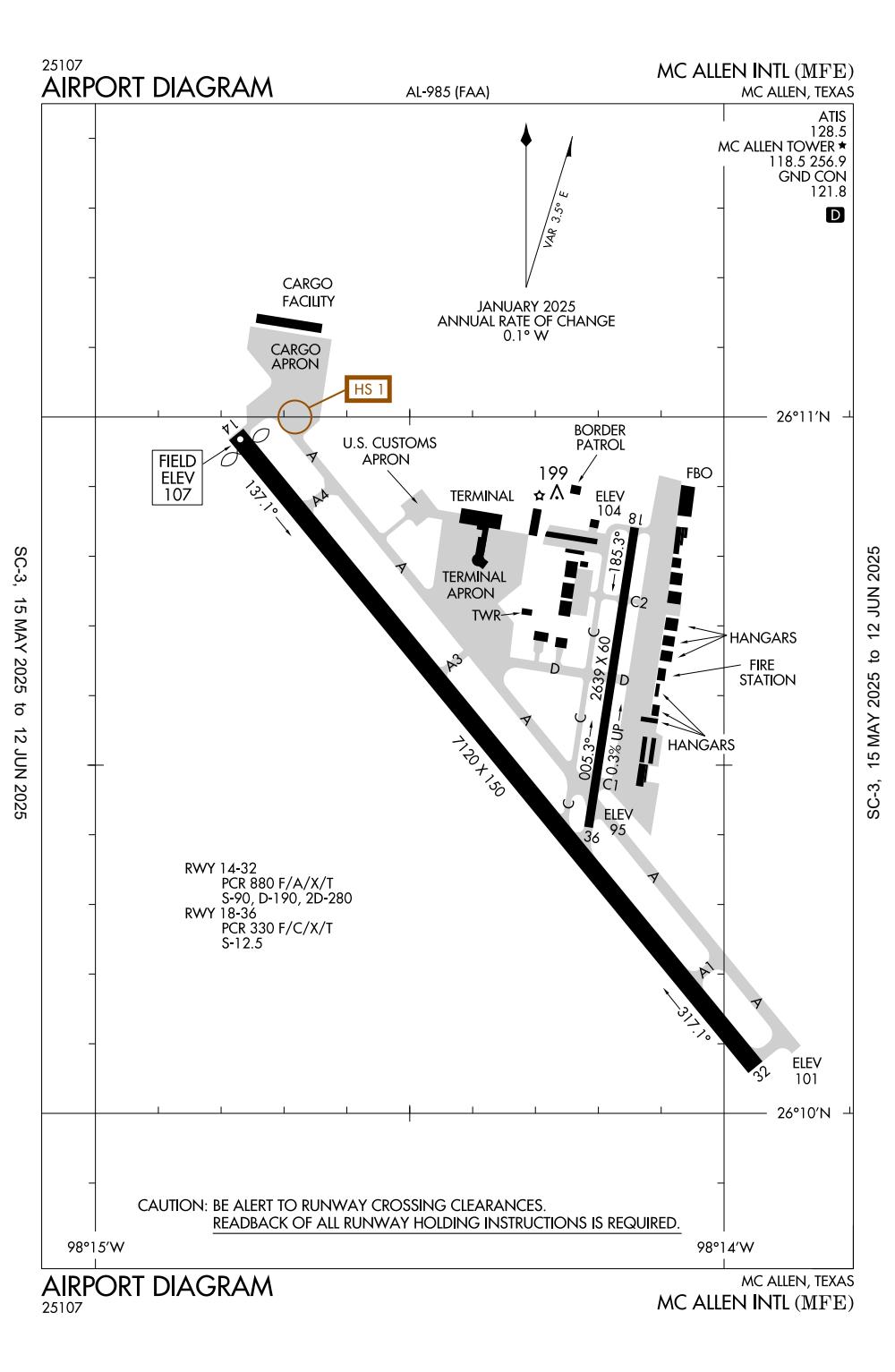 ICAO - KMFE, IATA - MFE, FAA ID - MFE